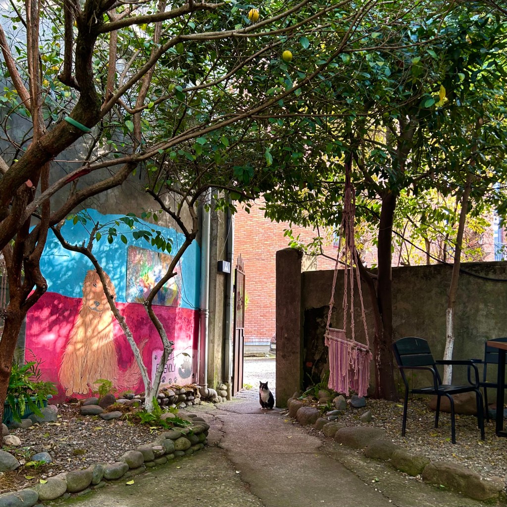 Это довольно упитанный кот, который сидит у входа в кафе.
